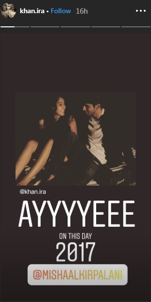 इरा ने इस बार इंस्टाग्राम पोस्ट करने के बजाया बॉयफ्रेंड के साथ स्टोरी शेयर की है, जो सिर्फ एक दिन के लिए प्रोफाइल पर दिखती है। इस खुबसूरत तस्वीर के जरिए इरा ने 26 अगस्त 2017 के खास दिन को याद किया है। यह तस्वीर दो साल पुरानी है, जिसके लिए इरा ने कहा भी है, ‘2017 में आज ही के दिन।’ साथ ही उन्होंने मिशाल को टैग भी किया है। इरा खान और मिशाल के डेट की खबरें भले ही कुछ महीनों से सामने लगी हो, लेकिन इस फोटो से पता चलता है कि दोनों कुछ सालों से एक दूसरे के करीब हैं।